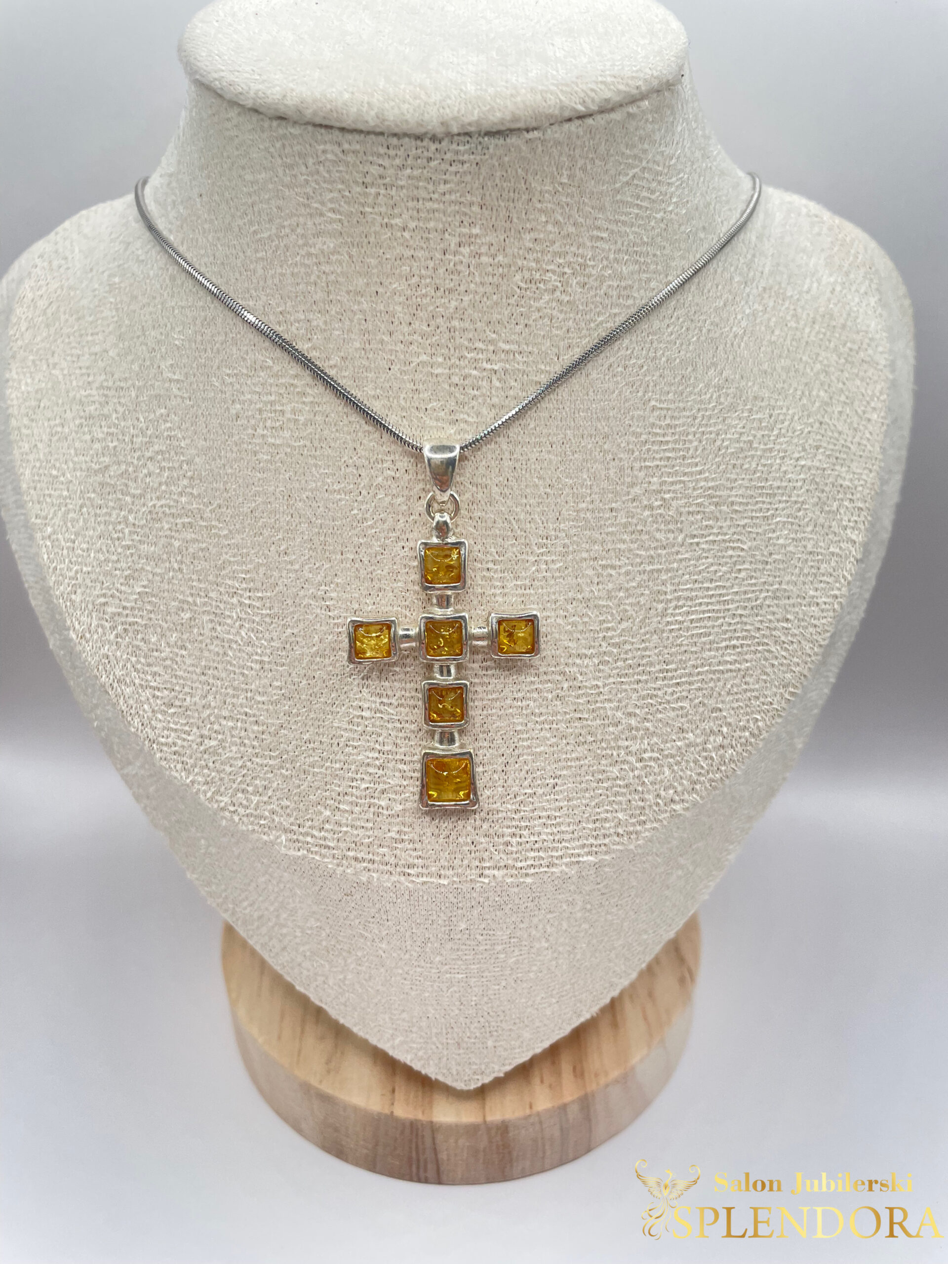 Subtelny, a zarazem wyrazisty krzyżyk wykonany ze srebra próby 925, ozdobiony naturalnym bursztynem bałtyckim. Ciepłe refleksy bursztynu pięknie kontrastują z chłodnym połyskiem srebra, tworząc wyjątkową biżuterię o duchowym i estetycznym wymiarze.