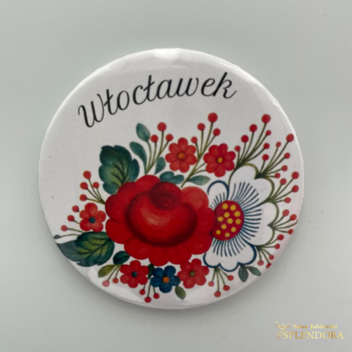 Funkcjonalny magnes z otwieraczem 58 mm z motywem fajansu włocławskiego w czerwonej kolorystyce łączy praktyczne zastosowanie z dekoracyjnym charakterem. Tył wykonany jest z grubej blachy stalowej, w której znajduje się otwór umożliwiający wygodne otwieranie butelek.